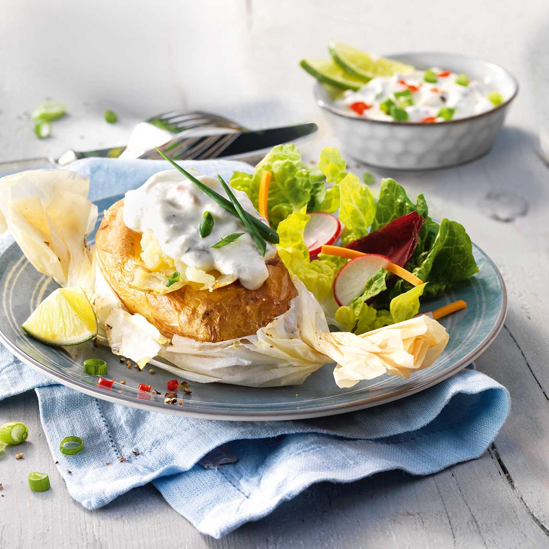 Ein würziger Dip wie dieser ist die Krönung jeder ofenfrischen Backkartoffel Und für die haben wir noch zwei Geling-Tipps: Festkochende Kartoffeln bleiben durchgegart besser in Form. Und wer dem Aufplatzen der Schale vorbeugen will, sticht die Kartoffeln vor dem Backen einige Male mit der Gabel ein.