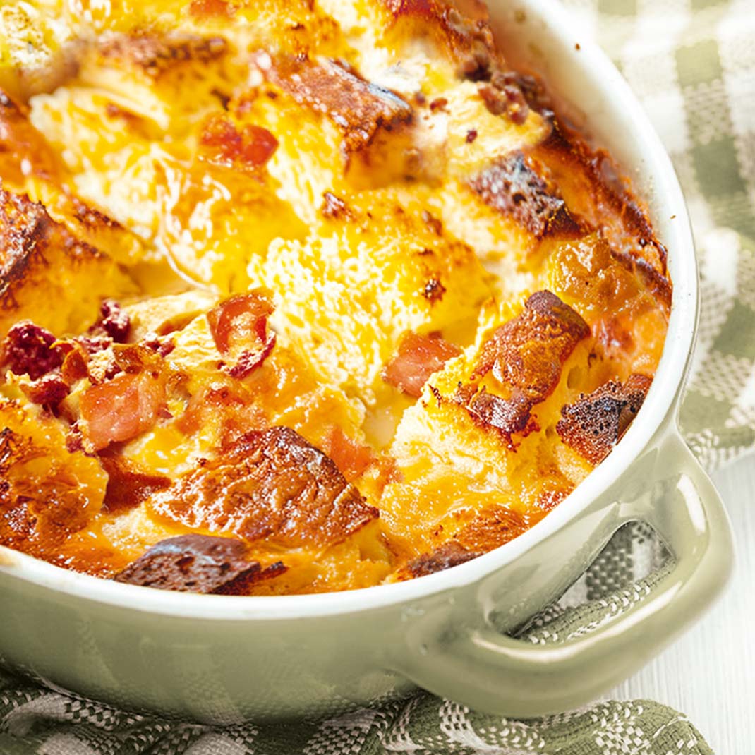 - Speckwürfel etwas abkühlen lassen und in einer ofenfesten, hohen Auflaufform verteilen.